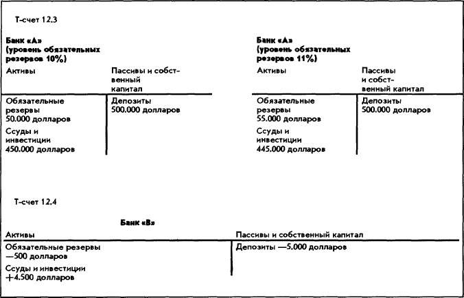 Страница 26 из 42 Влняние изменений уровня обязательных резервов. На Т-счете 12.3 приведено влияние изменения требований к уровню обязательного резервного покрытия с 10 до 11 % для некоего банка «А». В рассмотренном примере предполагается, что банк хранит обязательные резервы, ссуды и инвестиции в качестве активов и имеет в своем распоряжении лишь один тип вкладов. В ответ на это новое требование, банк способен обеспечить требуемый уровень обязательных резервов, сократив ссуды на 5.000 долларов, либо продавая на ту же сумму инвестиции. Например, если этот банк продает на 5.000 долларов ценных бумаг, он скорее всего получит за это чек, выписанный на другой банк, а его резервы возрастут на требуемые 5.000 долларов, как только он депонирует этот чек в Федеральном Резервном банке.